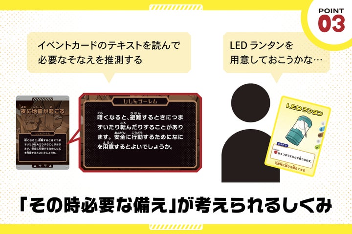 ゲームを通して、災害時に必要な判断力や備えの知識を楽しく学べる教材を目指す。