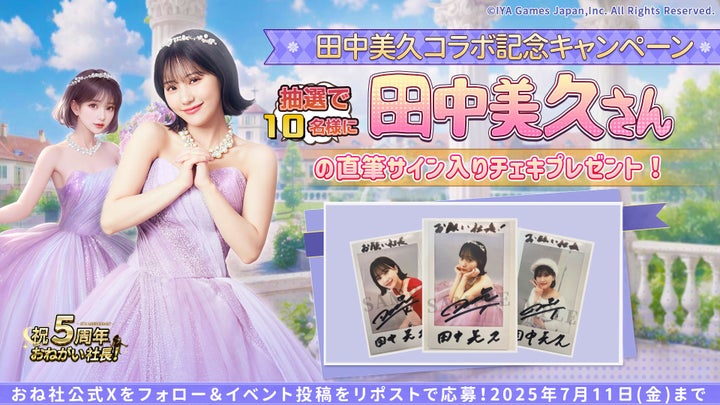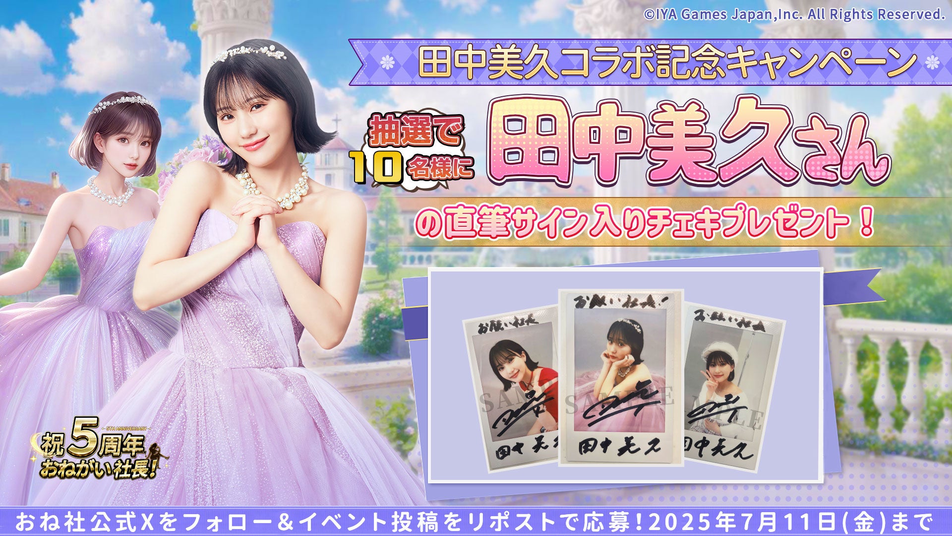 スマホ向け会社経営シミュレーションゲーム『おねがい社長!』がリリース5周年を記念し、田中美久さんをCMイメージキャラクターに起用。