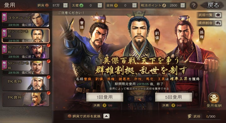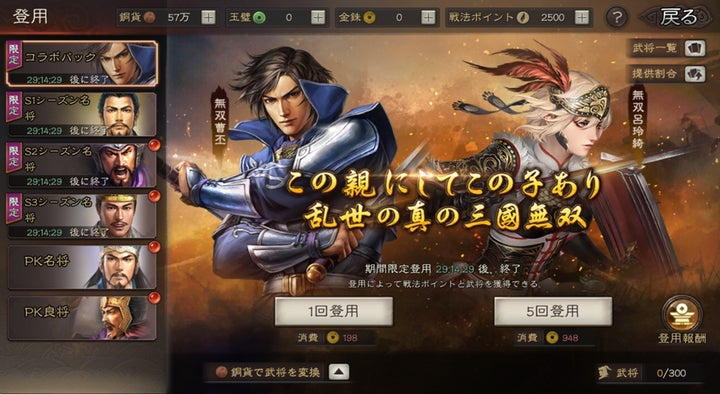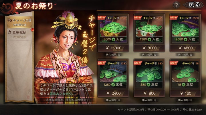 玉璧2倍チャージや、過去シーズンの武将パック復刻、コラボパック復刻など、盛りだくさんの内容です。