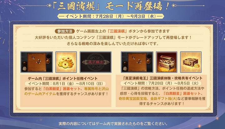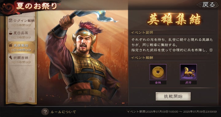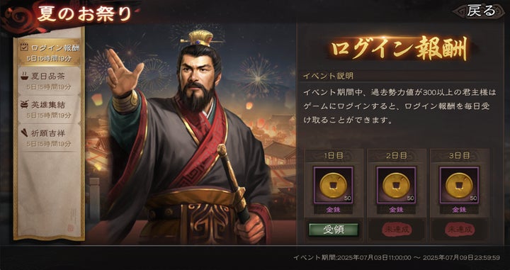 - 7月3日からはログイン報酬、夏日品茶、英雄集結などのイベントも開催。