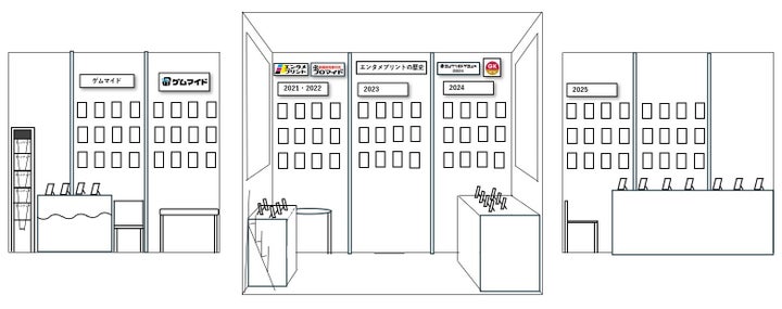 ブースは美術館をイメージしたデザインで、「エンタメプリント年表」や「ゲムマイド」のサンプル展示も行う予定。
