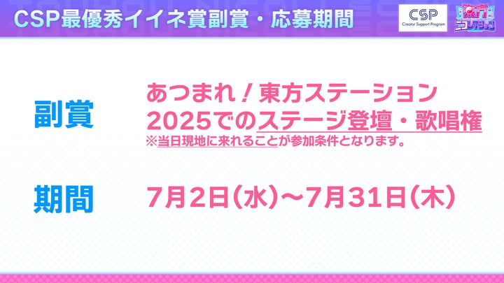 - 最優秀賞は「あつまれ!東方ステーション2025」でのステージ歌唱権、CSPイイね!賞は番組内での紹介と記念品。