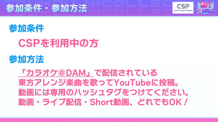 - 応募資格はCSPを利用中のクリエイターで、カラオケ@DAMで東方アレンジ楽曲を歌唱した動画をYouTubeに投稿。