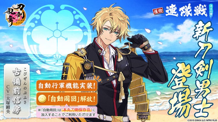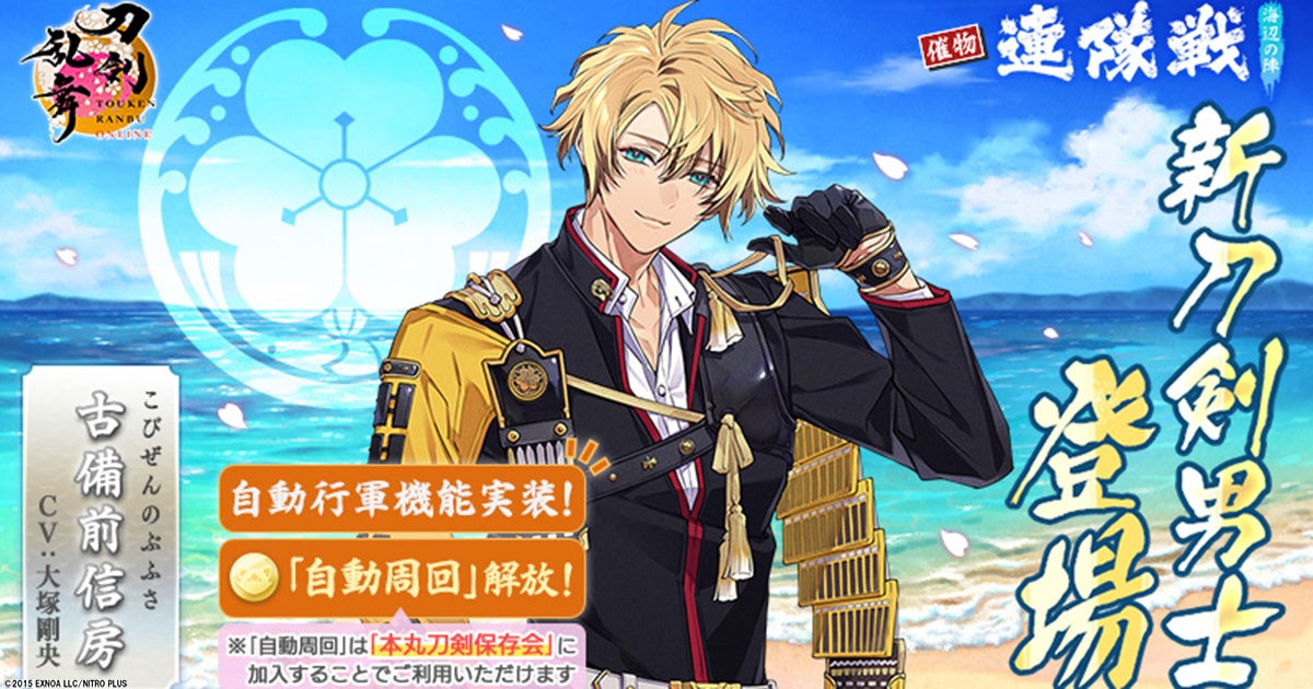 - 新刀剣男士「古備前信房(cv. 大塚剛央)」が登場するイベント「連隊戦 ~海辺の陣~」開催。