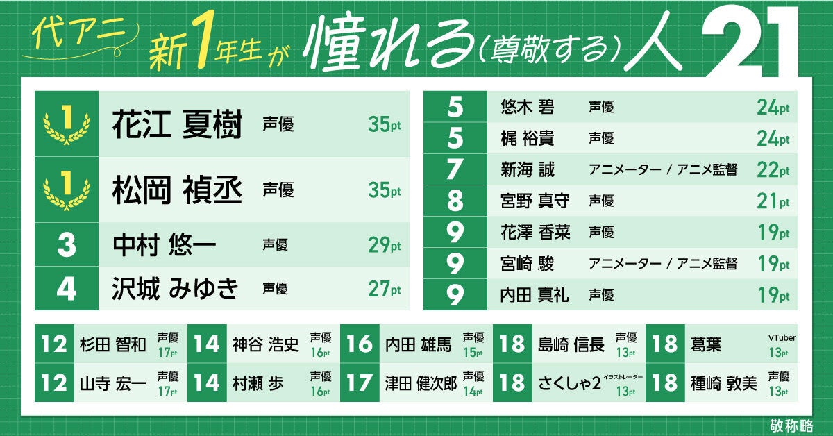 憧れの存在としては、声優の「花江夏樹さん」と「松岡禎丞さん」が同率1位となっています。