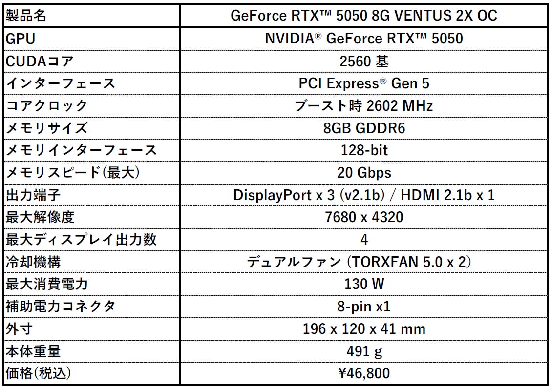 - MSIからGeForce RTX™ 5050搭載グラフィックスカード「GeForce RTX™ 5050 8G VENTUS 2X OC」が登場。