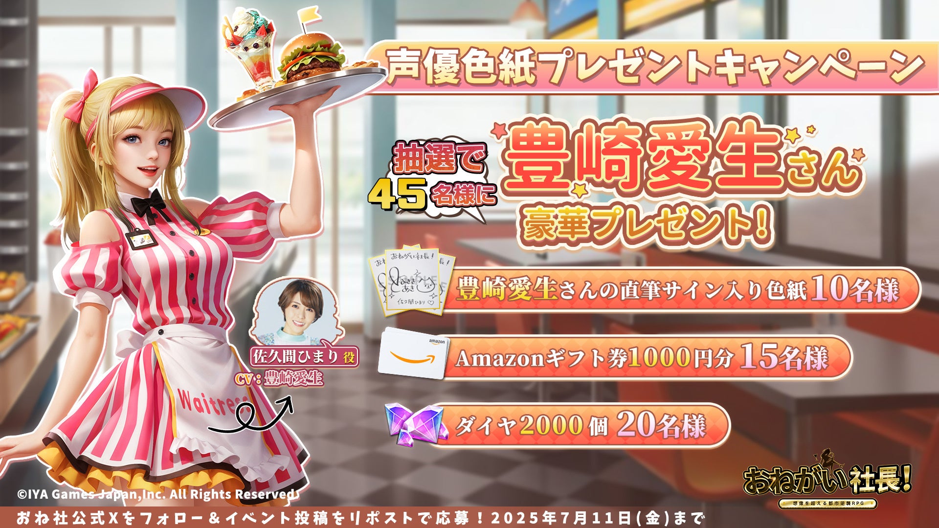 会社経営シミュレーションゲーム「おねがい社長!」に、人気声優・豊崎愛生さんが演じる新秘書「佐久間ひまり」が2025年7月5日(土)から登場します。