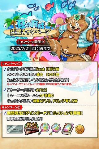 - 夏の育成応援キャンペーンでは、ランクと魂友EXP2倍、限定ログインボーナスを実施。