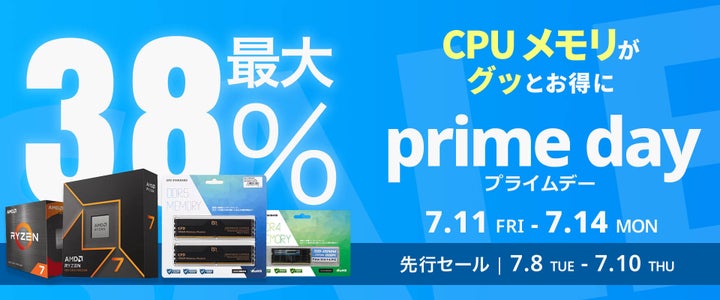Amazon プライムデーと先行セールにて、AMDのCPUとCFD販売のメモリなど24製品が最大38%オフになる。