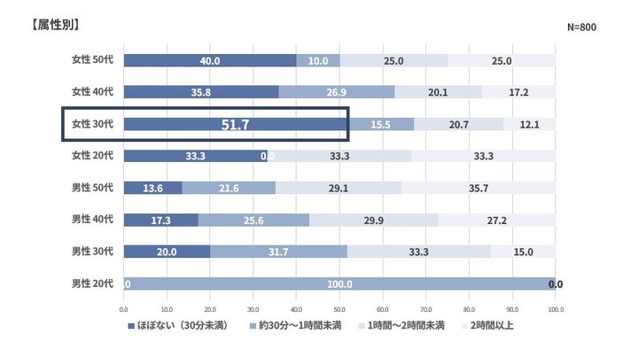 7割以上の親が1日の自由時間が2時間未満であり、30代女性では半数以上が30分未満という結果が出ています。