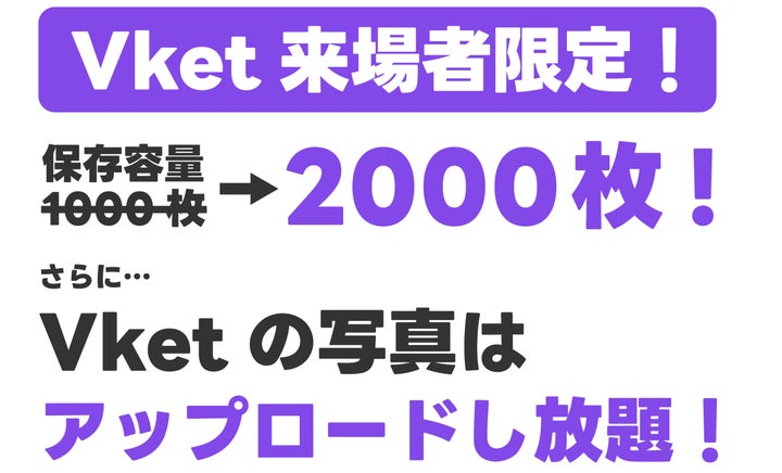 特典として、ストレージ上限のアップグレードや、Vketワールドで撮影した写真のストレージ容量へのカウント除外が用意されています。