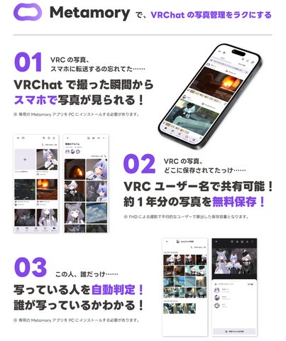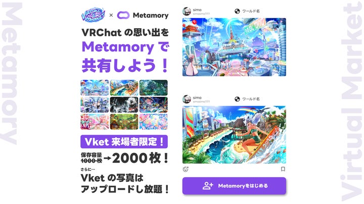 - Vketの思い出をMetamoryで共有できる企画が展開され、ストレージ上限アップなどの特典が用意。