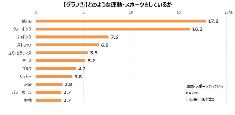 具体的にどのような運動・スポーツをしているかを聞いたところ、「筋トレ」が最も多く17.8%、次いで「ウォーキング」が16.2%でした。【グラフ③】