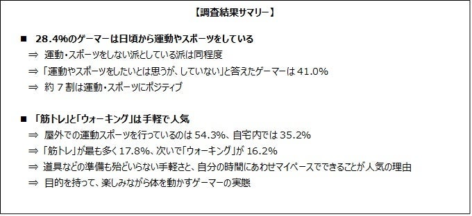 ゲーマーの運動・スポーツに対する関心を調査した結果、30.6%が運動・スポーツをしない一方、28.4%が日頃から何らかの運動・スポーツをしていることがわかった。