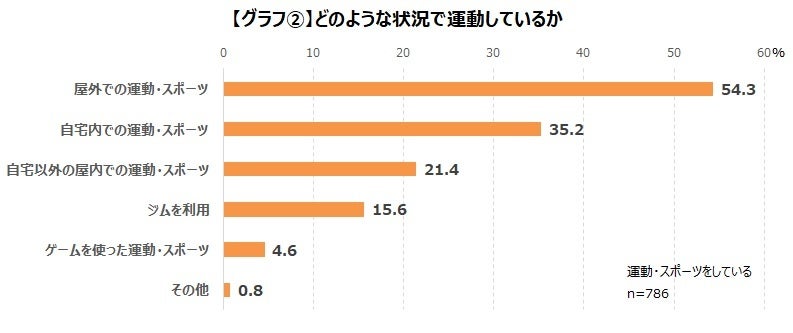 日頃、運動・スポーツをしていると答えたゲーマーに、どのような状況で運動・スポーツをしているかを聞いてみたところ、54.3%と半数を越えるゲーマーが「屋外での運動・スポーツ」と回答しました。また、「自宅内での運動・スポーツ」はコロナ禍で自宅で過ごす時間が増えたこともあってか、3割を超えています。一方で、「ジムを利用」と回答したのは2割以下と少なく、ジムには通わず自宅で手軽に運動している人が多く見られます。