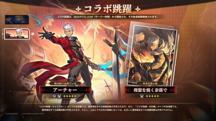 - コラボ限定星5キャラクターとしてセイバーとアーチャーが登場、それぞれ出現率アップのイベント跳躍を開催。
