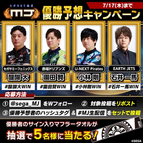 - 『セガNET麻雀 MJ』12周年記念大会が7月17日(木)19時よりYouTubeで生配信。