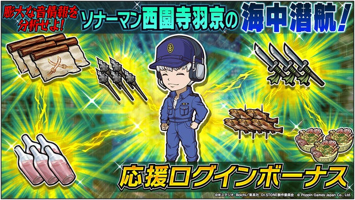 - 『Dr.STONE バトルクラフト』にて復刻イベント「[復刻]膨大な音情報を分析せよ!ソナーマン西園寺羽京の海中潜航!」開催。