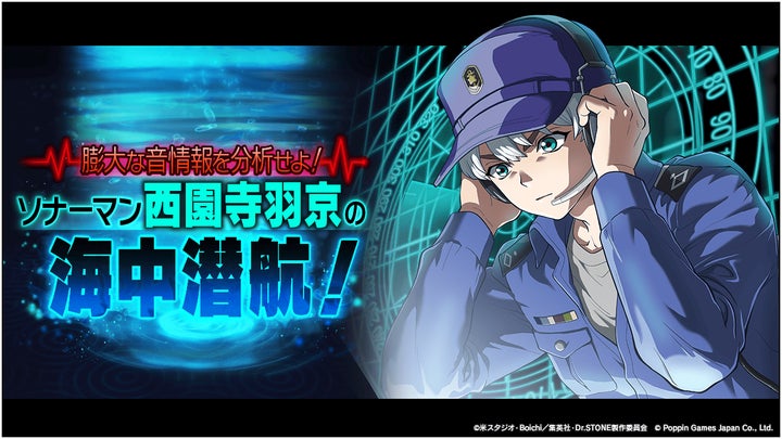 ポッピンゲームズジャパン株式会社は、『Dr.STONE バトルクラフト』にて復刻イベント「[復刻]膨大な音情報を分析せよ!ソナーマン西園寺羽京の海中潜航!」と新ガチャの開催を発表しました。