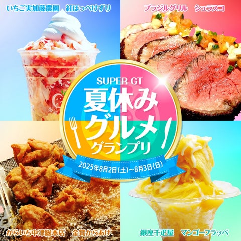 夏グルメが集まる「SUPER GT夏休みグルメグランプリ」や、オリジナルステッカープレゼント企画、ドライバーやチーム監督に会える「GTキッズウォーク」など、子供から大人まで楽しめる内容です。