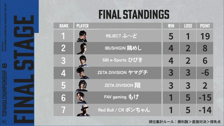 - プロeスポーツチーム「REJECT」のふ~ど選手が『TOPANGA CHAMPIONSHIP 6』で優勝。