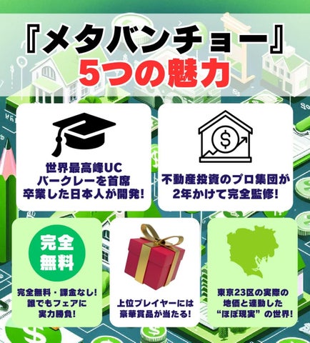 - 世界初の不動産投資シミュレーションゲームアプリ『メタバンチョー』が完全無料・課金なしでリリース。