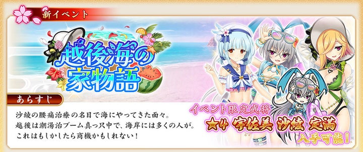 • 『戦国†恋姫オンライン ~奥宴新史~』にて、7月16日より水着イベント「越後海の家物語」を開催。