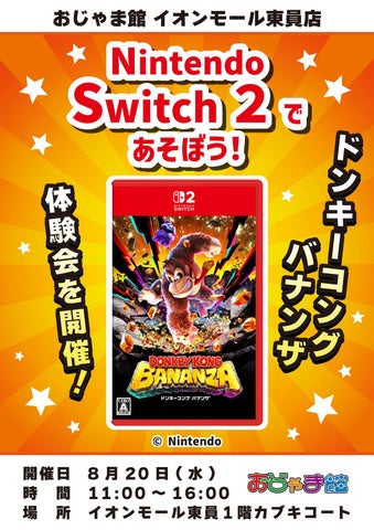 株式会社カジ・コーポレーションは、2025年7月19日、8月9日、8月20日に「おじゃま館 三宮店」と「おじゃま館 イオンモール東員店」にて、Nintendo Switch™ 2用ソフト「ドンキーコング バナンザ」の体験会を開催する。
