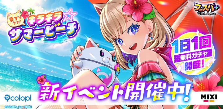 コロプラとMIXIが共同で手掛けるスマホ&PC向けゲーム『フェスバ+』にて、新イベント「夏マリです!キラキラ☆サマービーチ」が2025年7月18日より開催。