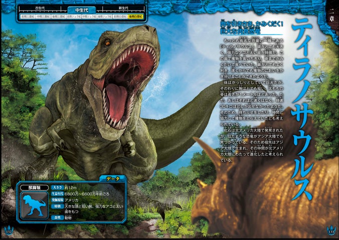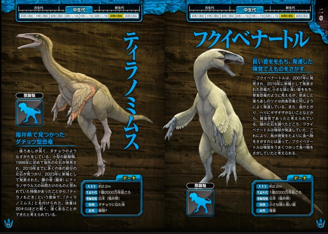 最新の研究成果に基づき、フクイベナートルやティラノミムスなどの新種も網羅。