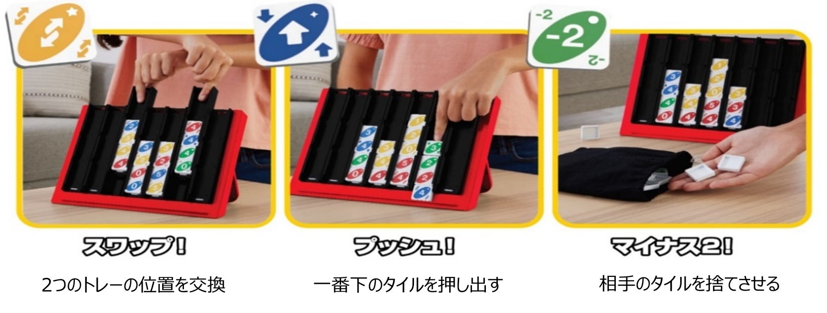 「ウノ クアトロ ならべてフォー」は、タイルを並べて遊ぶ進化系ゲームで、記号付きタイルが流れを大きく左右し、最後まで勝者はわからない駆け引きが楽しめます。