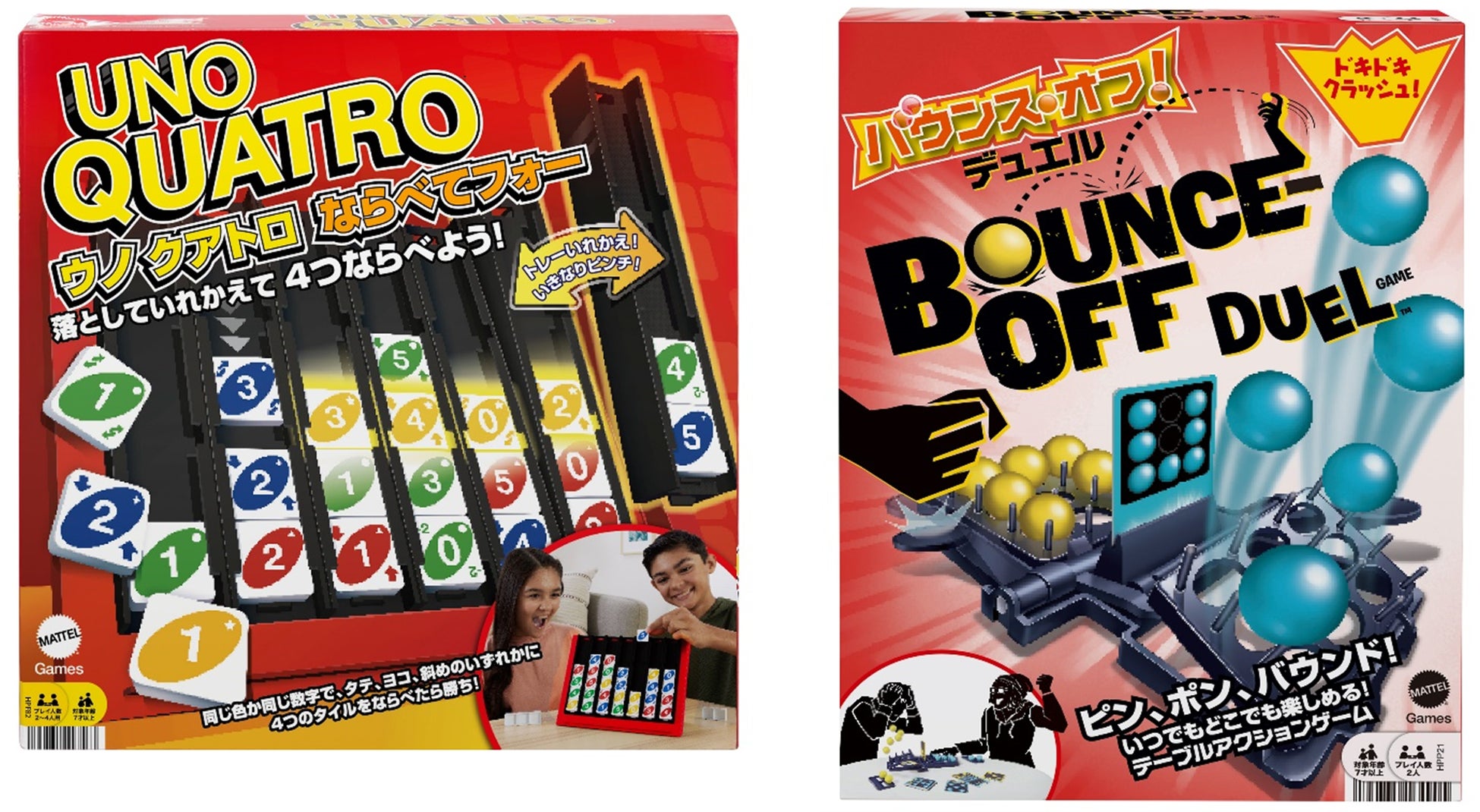 米国マテル社の日本法人、マテル・インターナショナル株式会社は、7月29日に大人気カードゲーム「ウノ」の新商品「ウノ クアトロ ならべてフォー」と新感覚テーブルアクションゲーム「バウンス・オフ」の2人対戦版「バウンス・オフ・デュエル」を発売します。