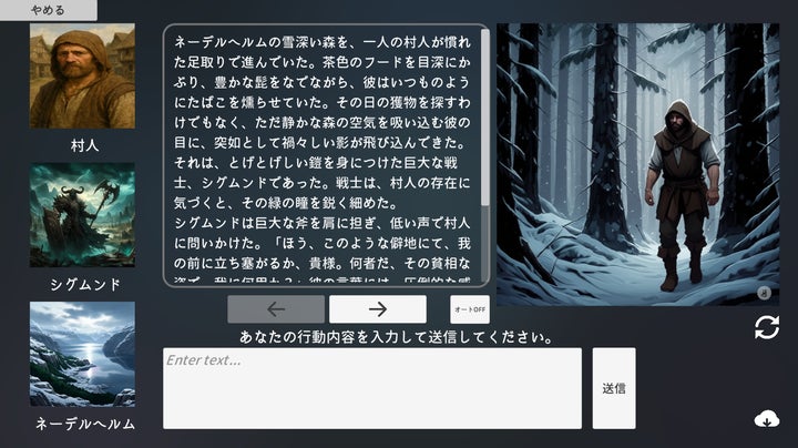 AIがキャラクターの行動や会話を生成し、画像とテキストで物語を描写。