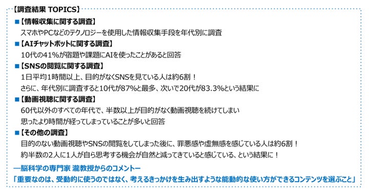 - 長時間SNSや動画を視聴した後の罪悪感や虚無感、思考機会の減少が課題として浮き彫りになった。