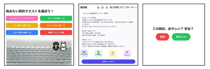 このゲームは、子どもたちが電子契約の基本的な流れやリスクを模擬体験できる設計。