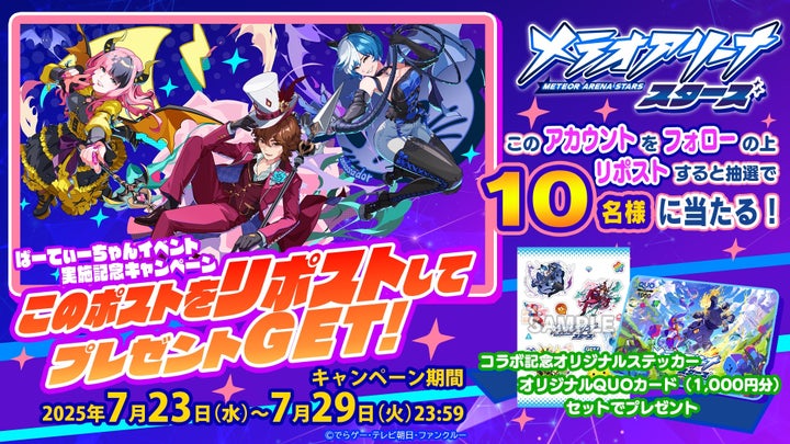 スマートフォン向けハイスピードレイドアクションゲーム『メテオアリーナ・スターズ』が、お笑いトリオ「ぱーてぃーちゃん」とのコラボイベントを2025年7月23日より開催。