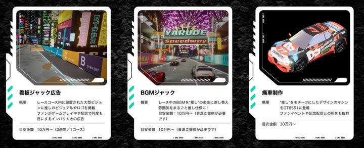 ファンは、推しデザインの痛車でレースに参加したり、推しの楽曲をBGMに設定したり、コース内のサイネージに推しの広告を掲出したりすることで、メタバース空間で推しを応援できる。
