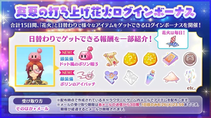 また、キャラクター育成を支援する期間限定イベント「行くぜ!真夏のアドベンチャー」も開催され、「真夏のトレーニング」やログインボーナスでアイテムを入手可能。