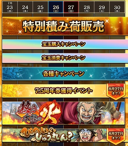7.5周年を記念し、様々なキャンペーンが実施され、ログインボーナスやガチャ、宝玉消費・購入キャンペーン、記念パック販売などが行われます。