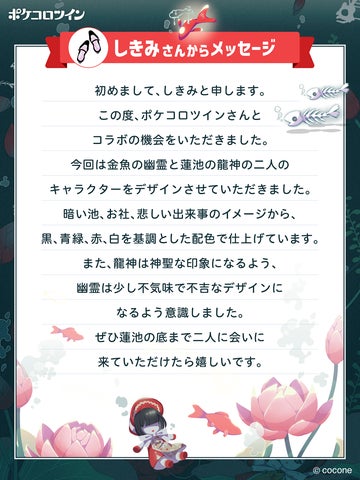- 『ポケコロツイン』の人気企画第10弾として、イラストレーターしきみ氏のイラストをアイテム化。
