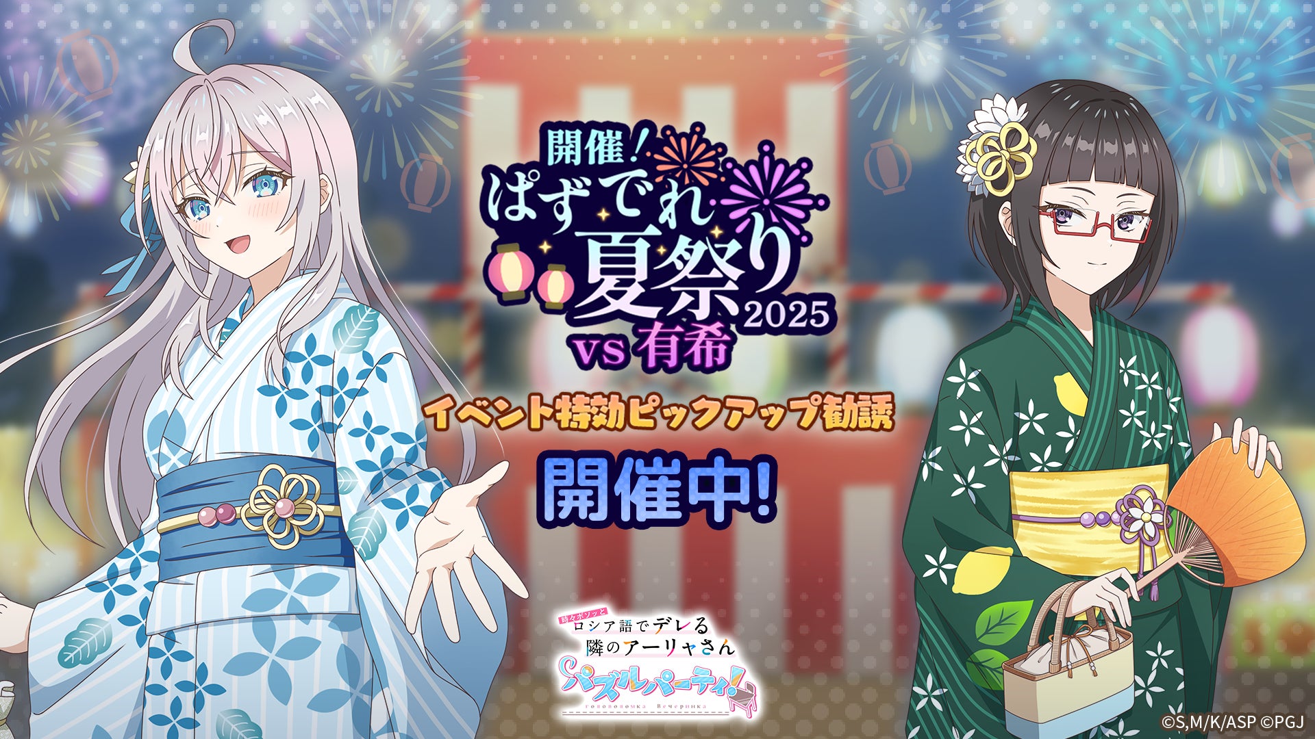 ポッピンゲームズジャパン株式会社が開発・運営するスマホゲーム『時々ボソッとロシア語でデレる隣のアーリャさん パズルパーティ!』(ぱずでれ)にて、浴衣姿のアーリャと沙也加が登場するイベント特効勧誘と、累計スコアランキングイベント「開催!ぱずでれ夏祭り2025VS有希」が開催されます。