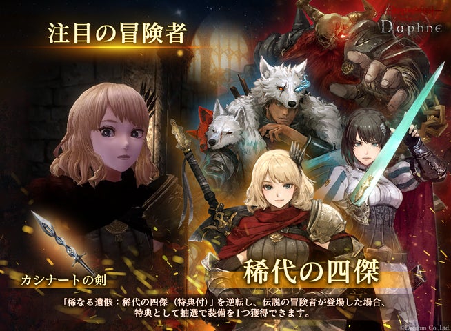 「注目の冒険者:稀代の四傑」では、伝説の冒険者が各1.25%の割合で出現し、特典として抽選で装備を獲得できるチャンスがあります。