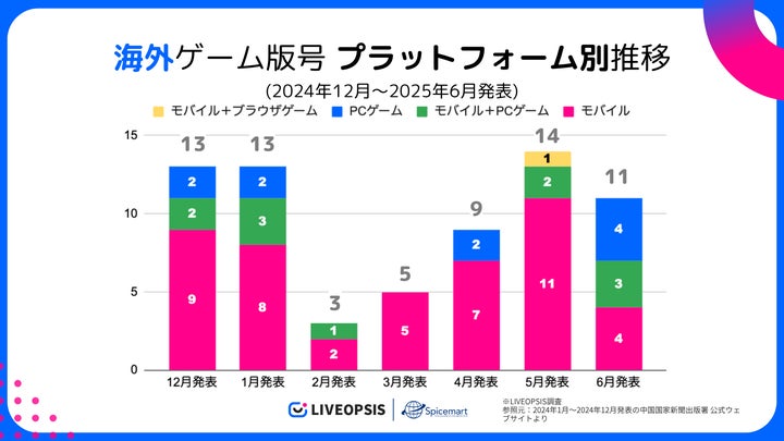 海外ゲームの版号取得は11作品に留まったものの、プラットフォーム構成に変化が見られ、PCゲームやPC+モバイル対応が増加。