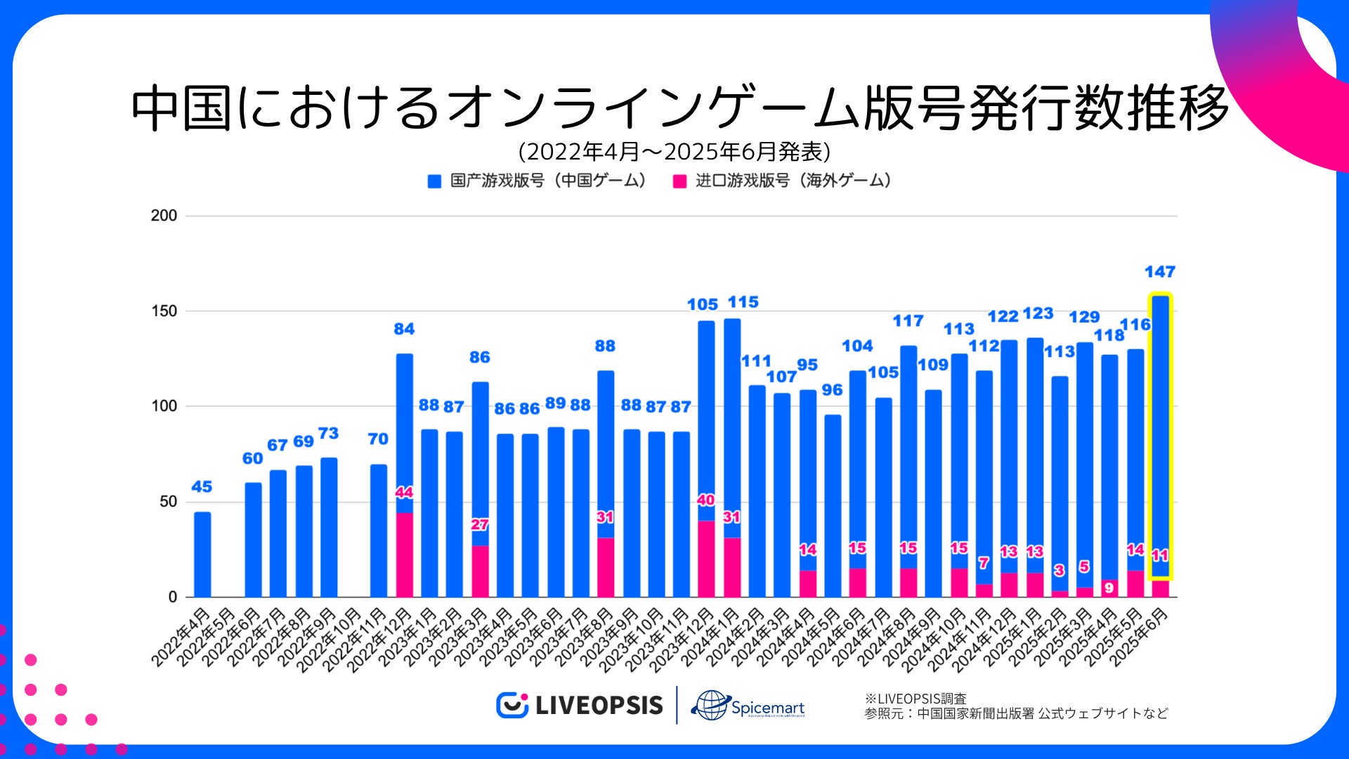 • 2025年6月、中国ゲームの版号取得数は147作品で過去3年で最多。