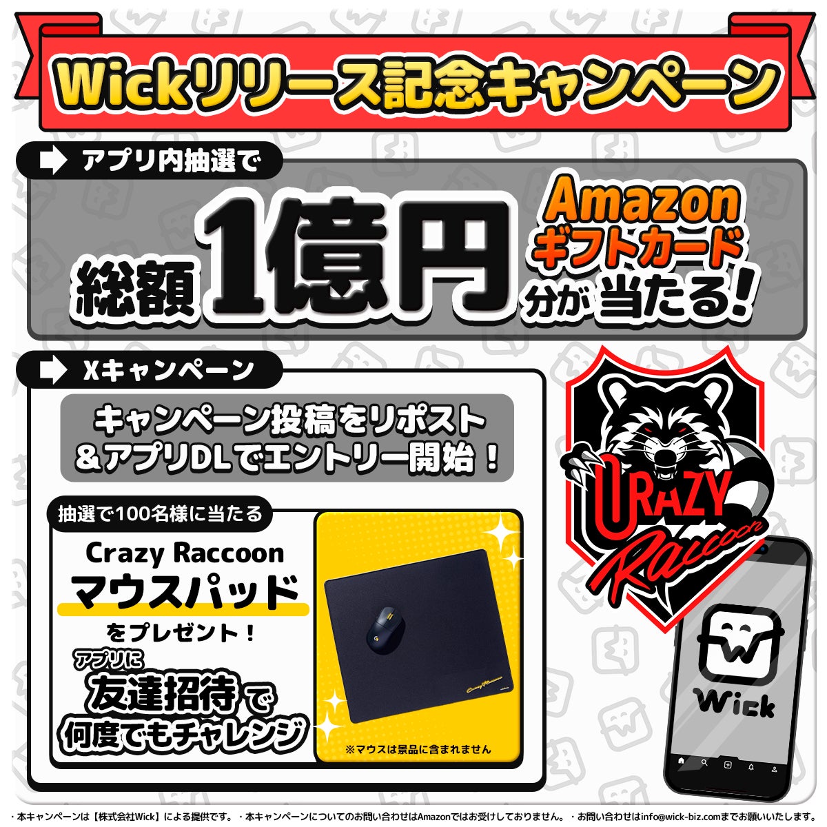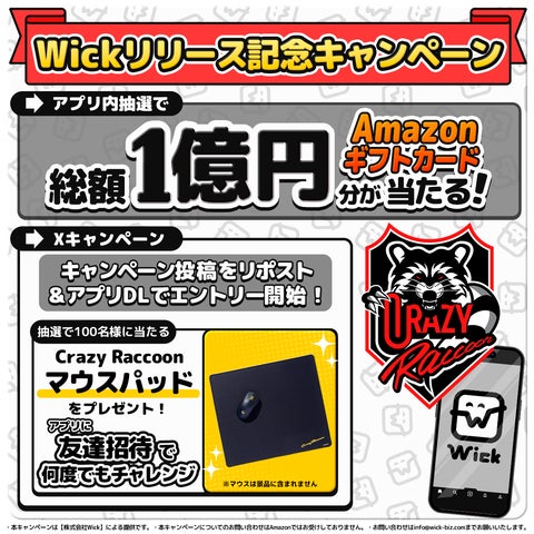 株式会社Wickは、2025年7月25日に漫画アプリ「Wick」のリリースを記念し、esportsチームCrazy Raccoonのオリジナルマウスパッドが当たるキャンペーンを開催する。