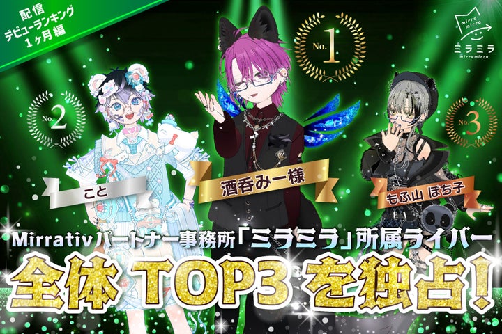 Mirrativパートナー事務所「ミラミラ」所属ライバーが、Mirrativ内のイベント「配信デビューランキング~1ヶ月編~」で全体TOP3を独占した。