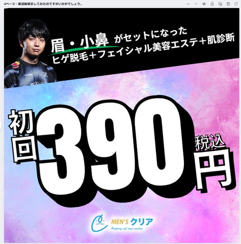 眉・小鼻ケア付きヒゲ脱毛、フェイシャル美容エステ、肌診断がセットになった初回限定390円(税込)のキャンペーンを実施。