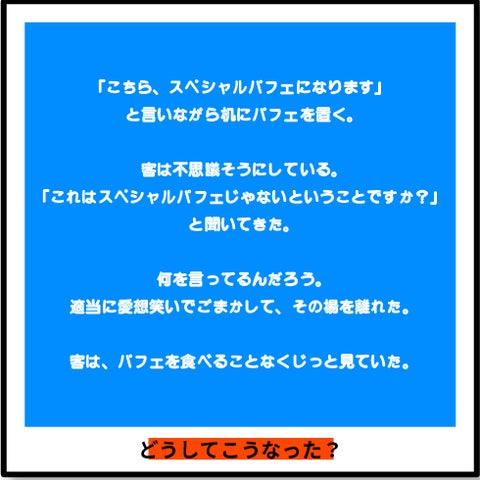 展示内容は、床に落ちたケーキや割れた皿など、”どうしてこうなった”のかを来場者が考察する内容。