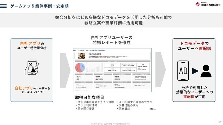 レポートでは、ゲームアプリ市場の概況、ドコモデータからの利用実態、ユーザープロファイリングの詳細データなどが提供される。