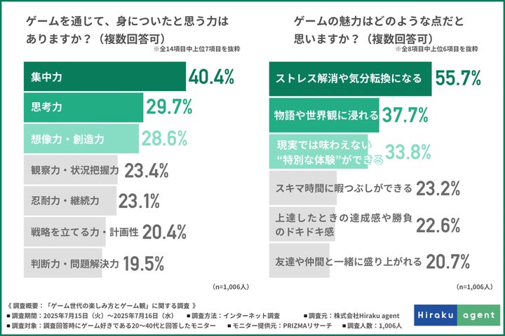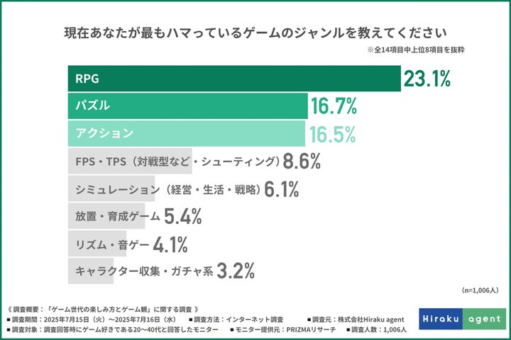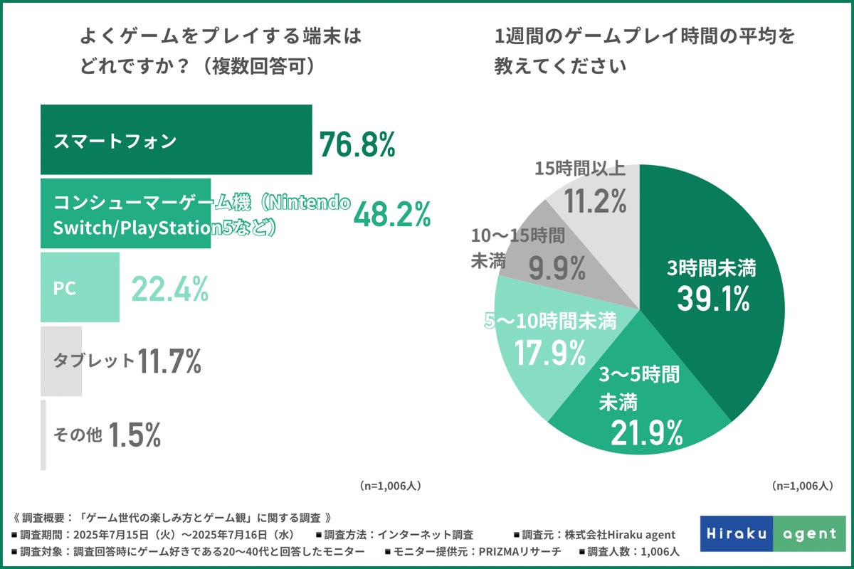 株式会社Hiraku agentが、20~40代のゲーム好きを対象に「ゲーム世代の楽しみ方とゲーム観」に関する調査を実施。